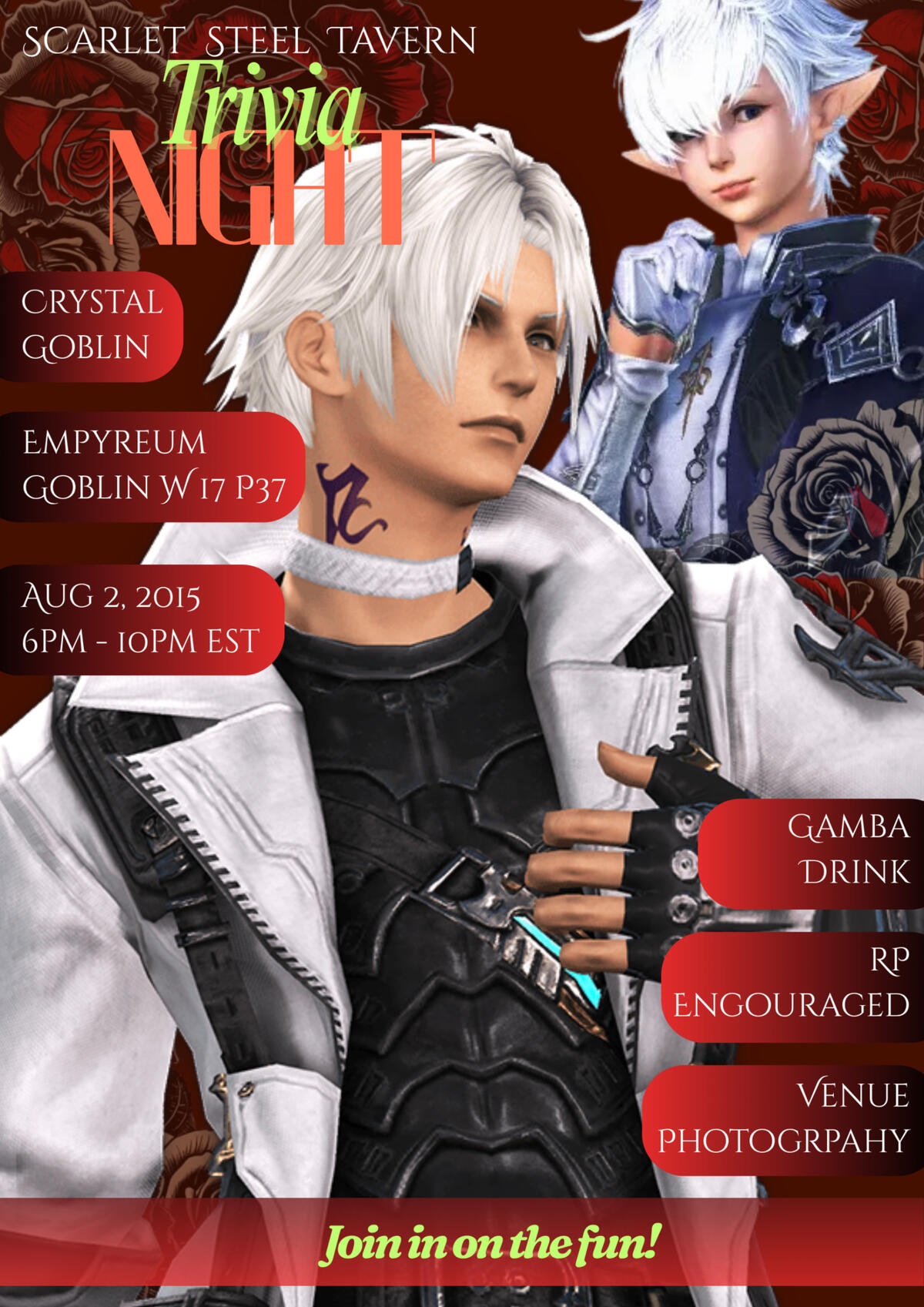 On Saturday August 2nd Scarlet Steel Tavern will be hosting its first of many trivia nights and YOU'RE INVITED!! So brush up on your FFXIV character trivia! A special summer menu will be available for purchase along with our regular menu. Prizes will be available for the top 10-12 people in the trivia night.
